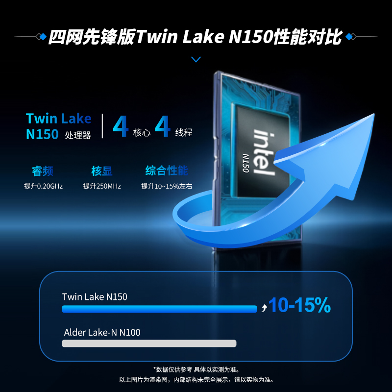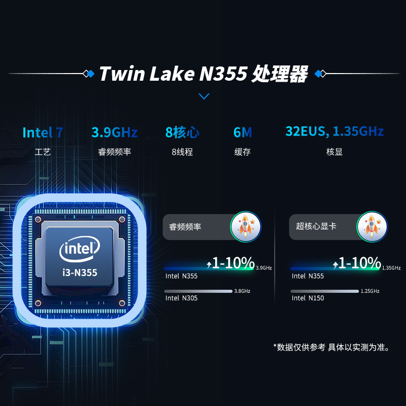 显示芯片 N150:1GHz/24EUS | N250:1.25GHz/32EUS | i3-N355:1.35GHz/32EUS